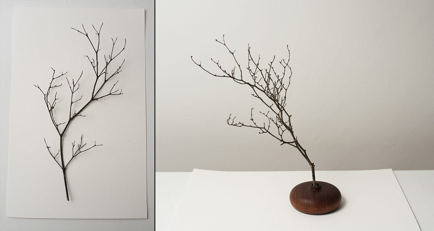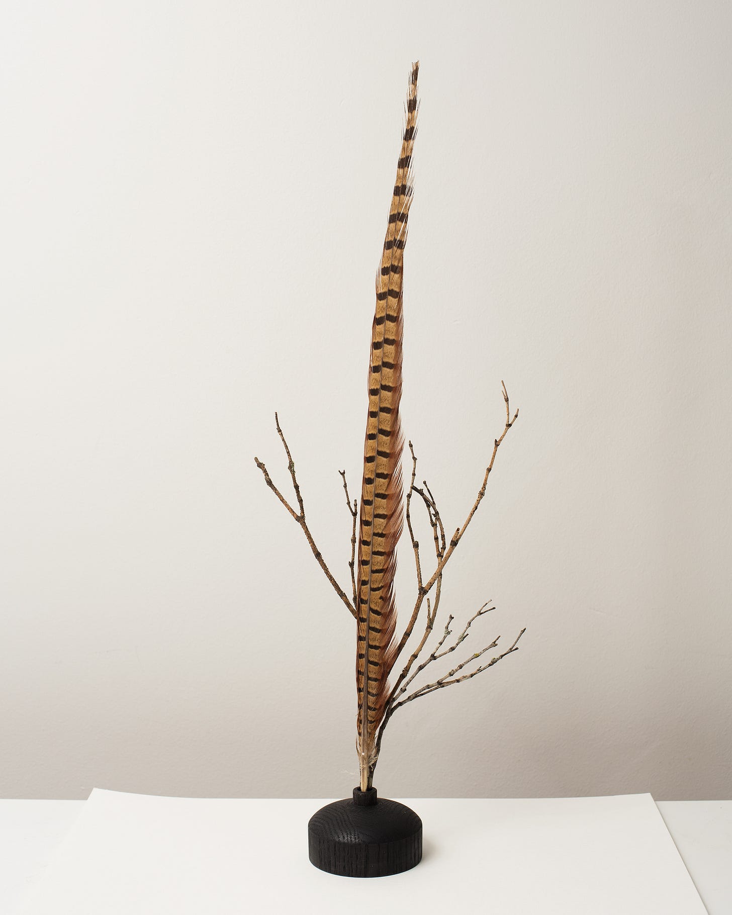 For twigs, I usually find them on the ground or from trimming the dead undergrowth of bushes. I like species that have a lot of branching at short intervals, such as Japanese Maple or Azalea. I also enjoy Hemlock for their texture and their tiny pinecones. In general, I look for twigs that seem to imply gesture or movement. When mixing elements in the same arrangement, it can be nice to couple these with a more rigid element, such as this pheasant feather.