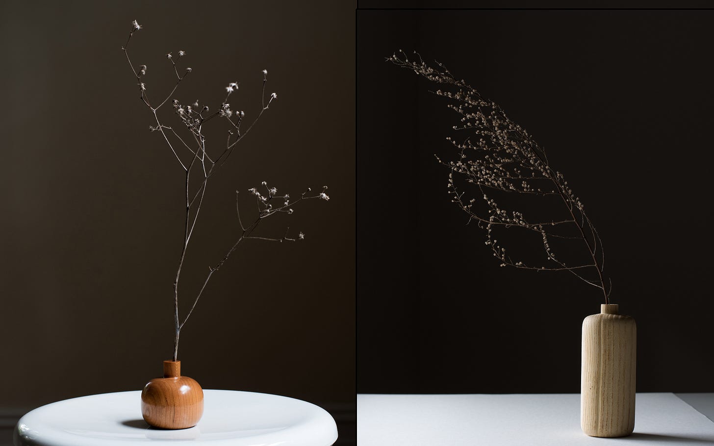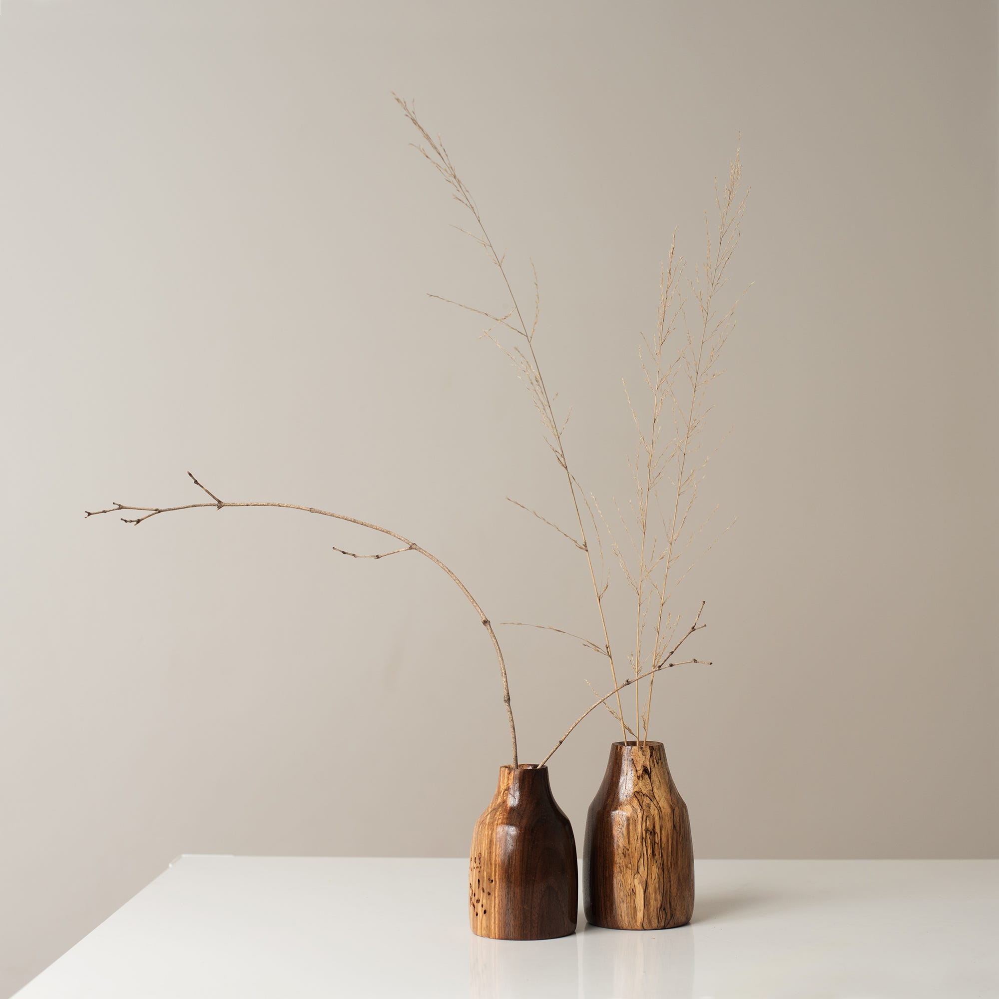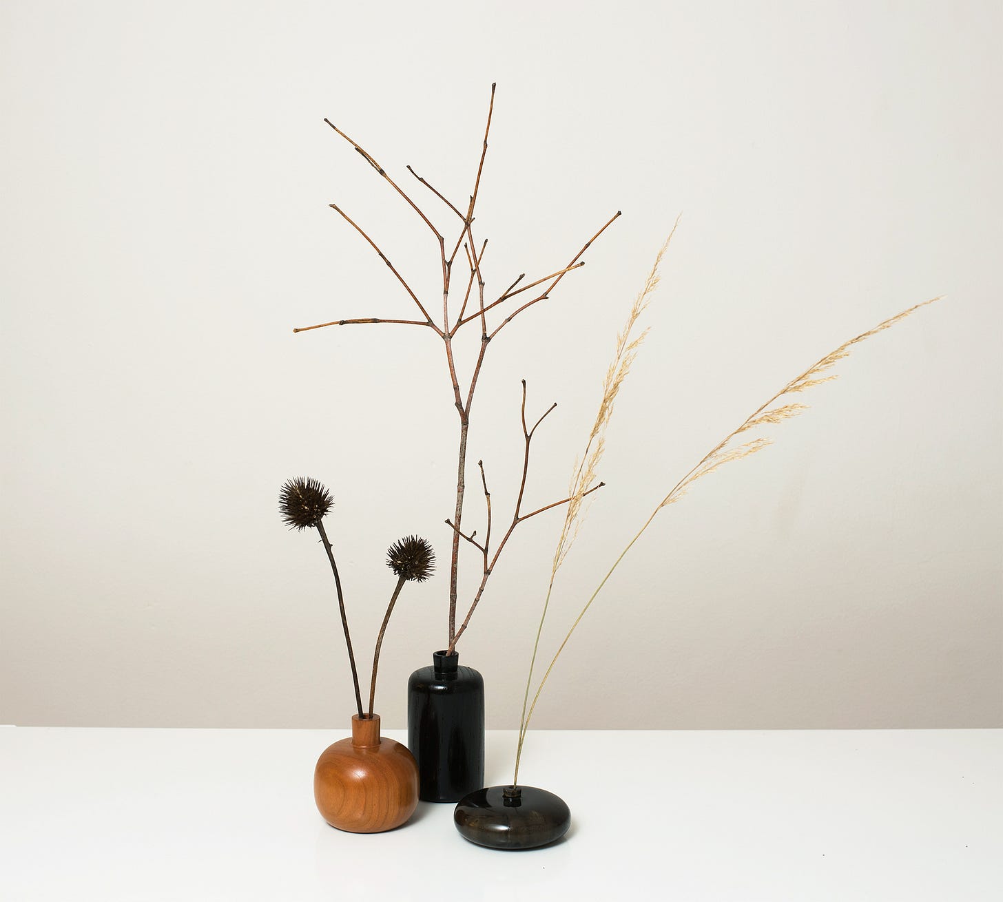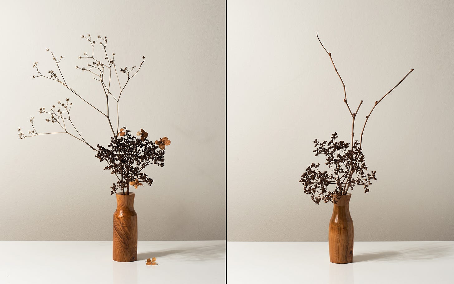 I wanted to make wooden vases early in my turning work. After acquiring my lathe, the first accessory that I bought was a chuck to hold the drill bits that would allow me to bore their center holes. And because wooden vases can’t hold water without an insert, I started making simple arrangements with dried botanicals.