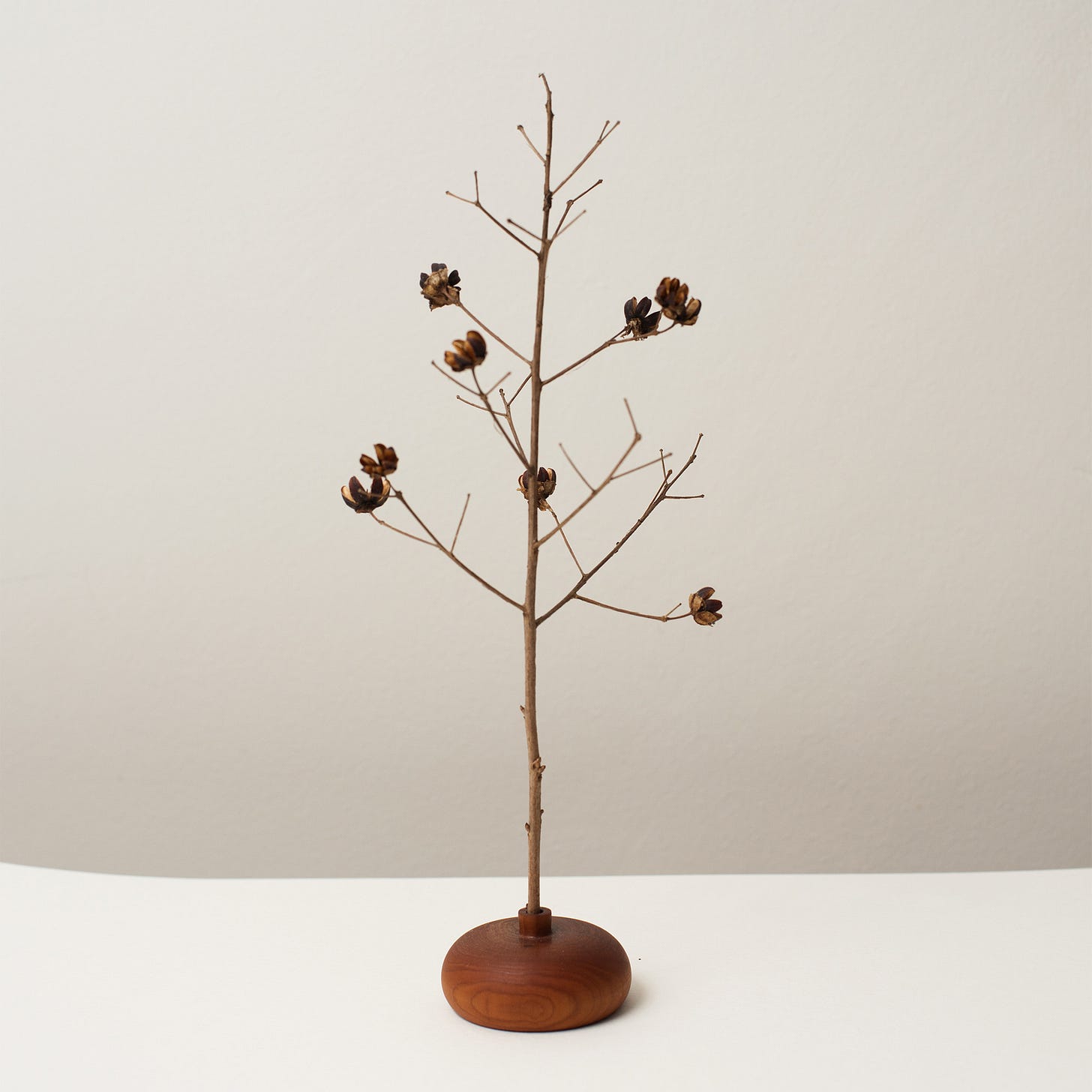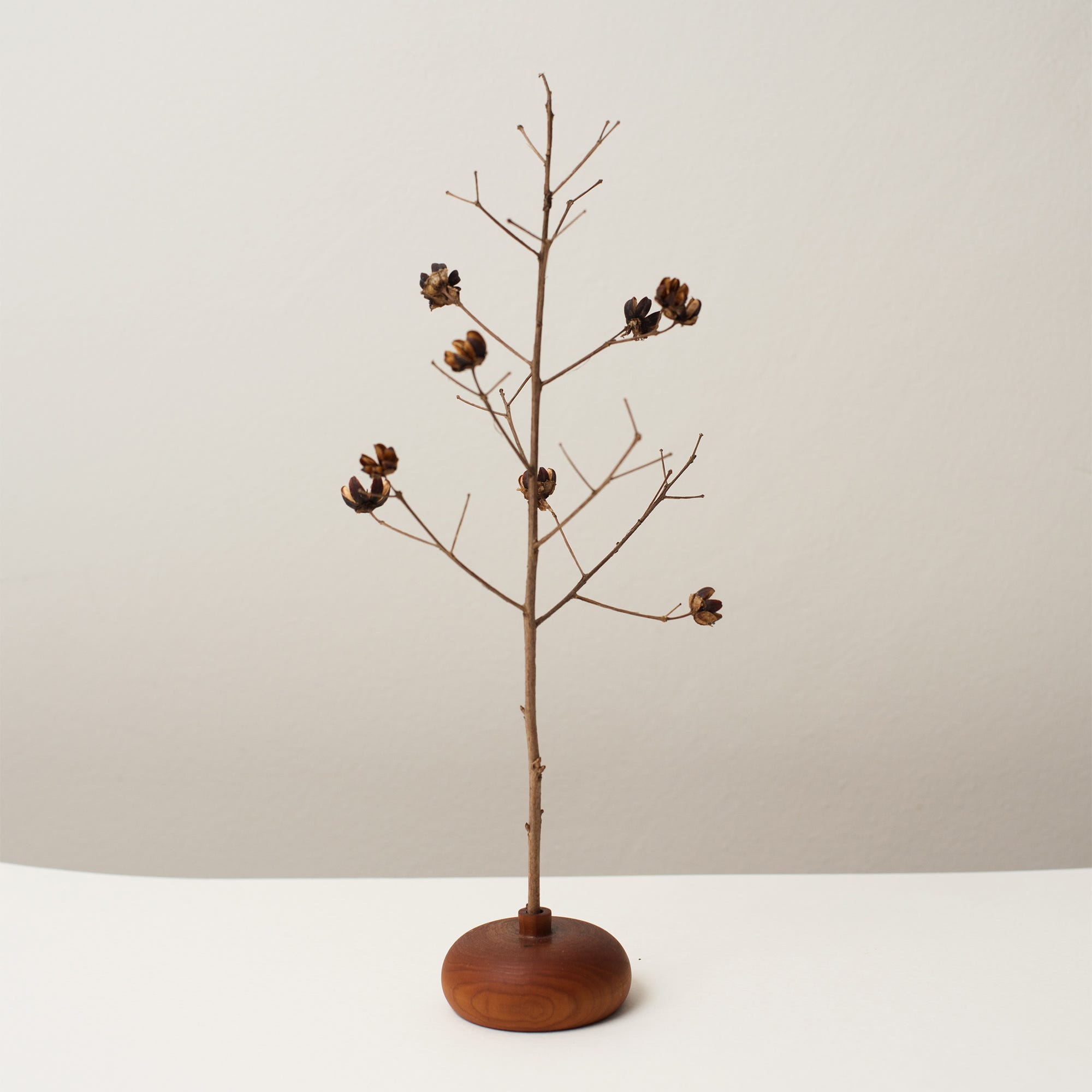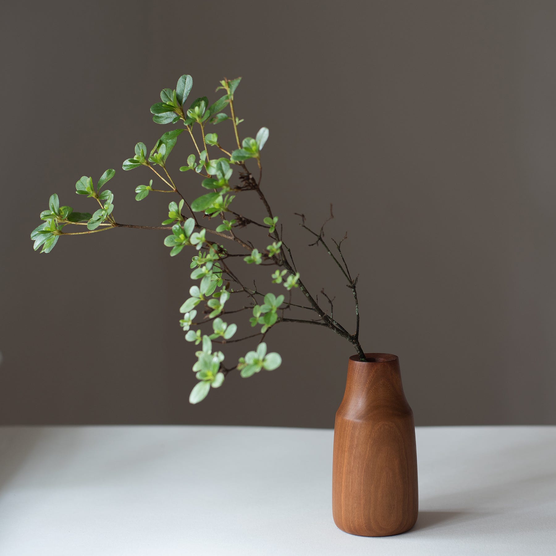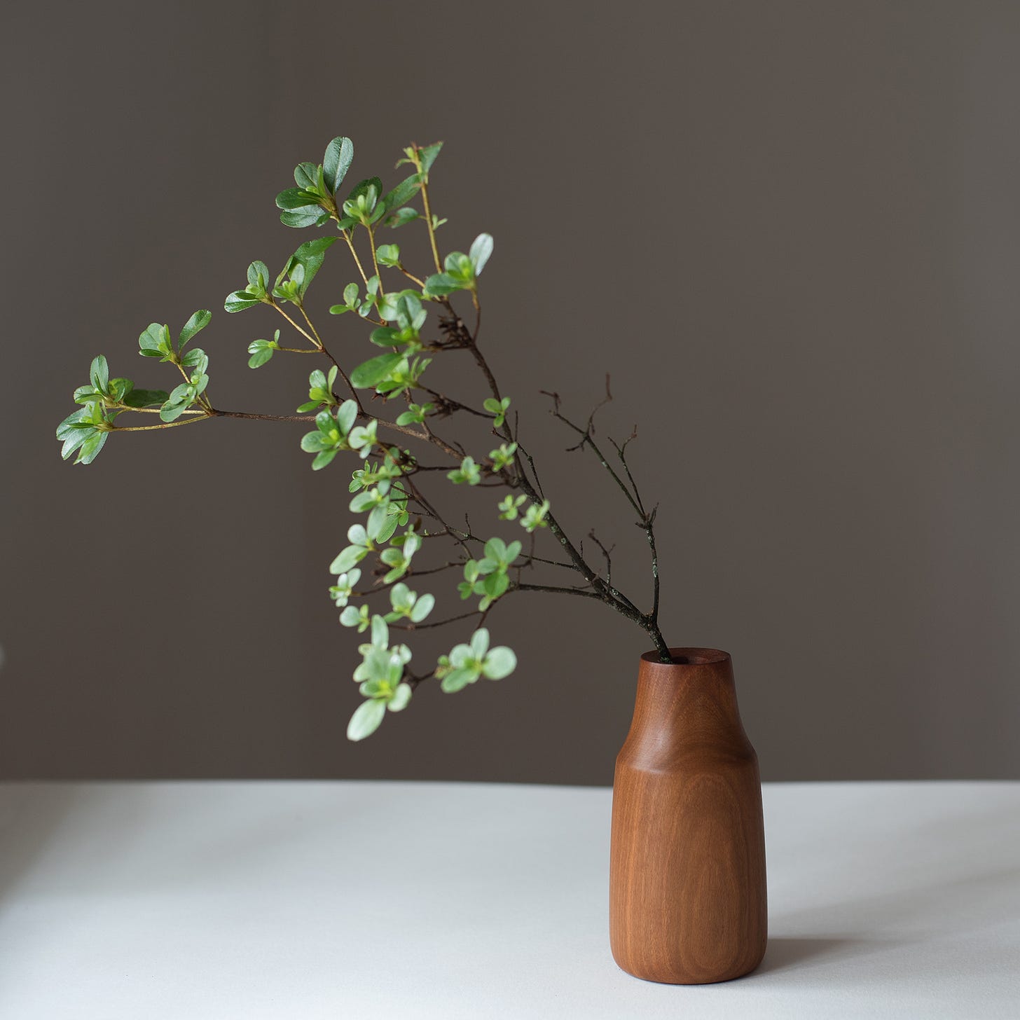 I wanted to make wooden vases early in my turning work. After acquiring my lathe, the first accessory that I bought was a chuck to hold the drill bits that would allow me to bore their center holes. And because wooden vases can’t hold water without an insert, I started making simple arrangements with dried botanicals.