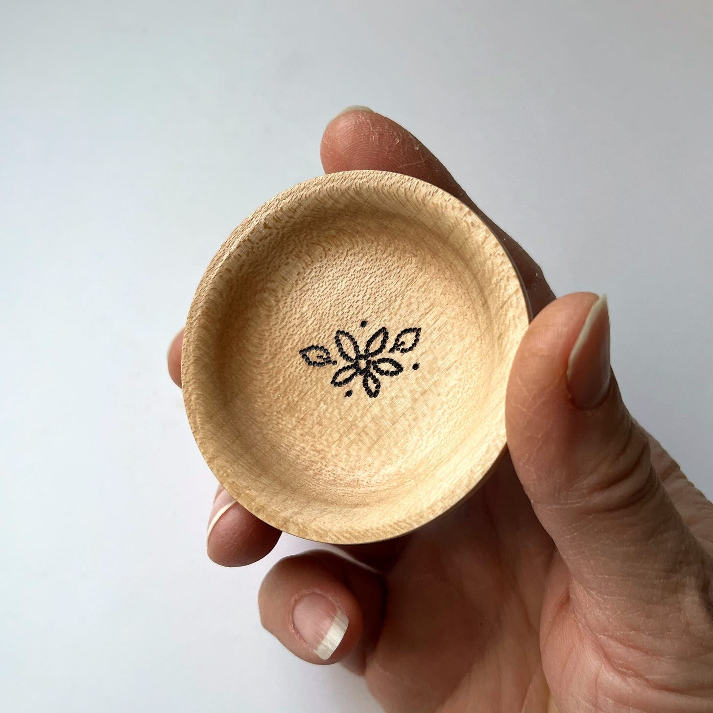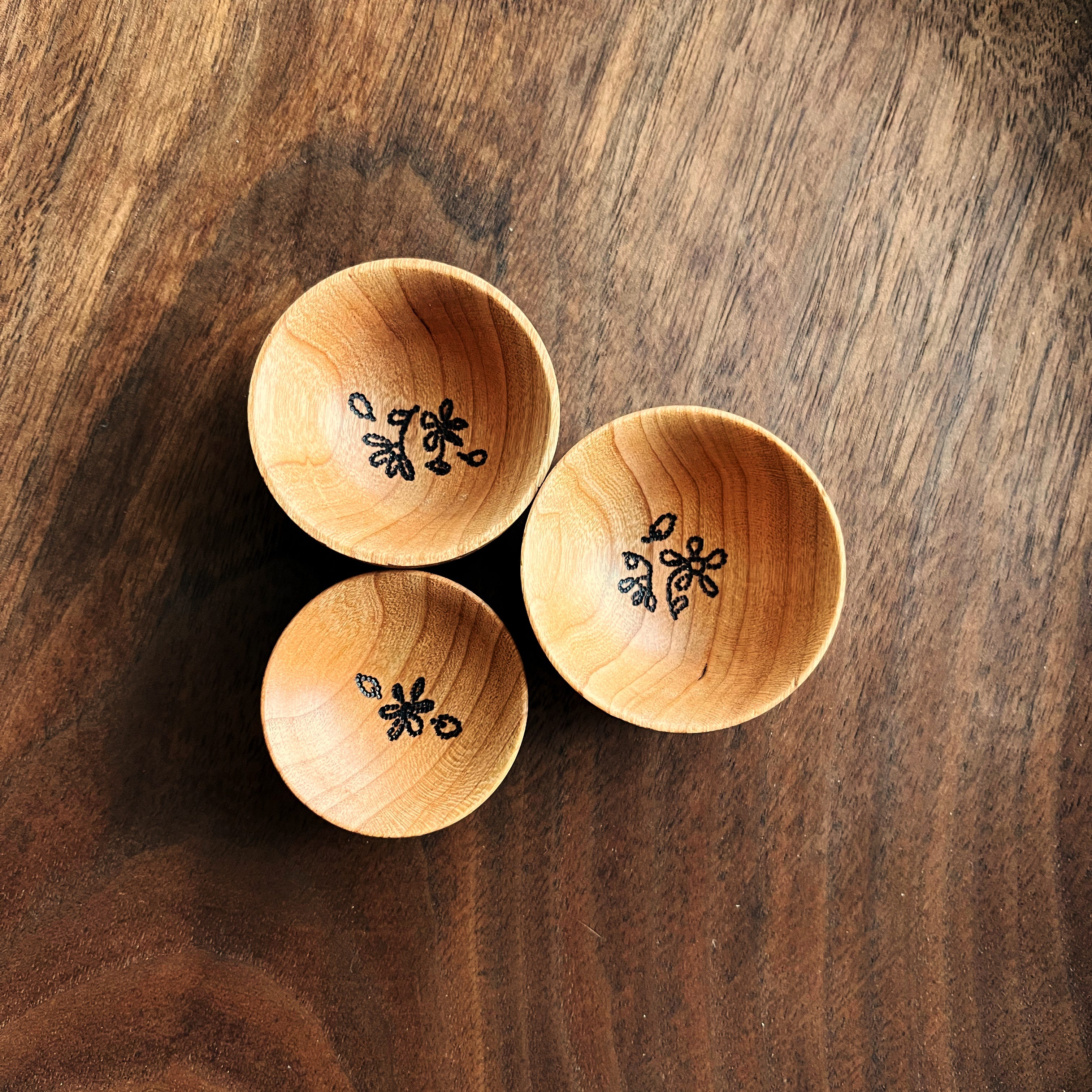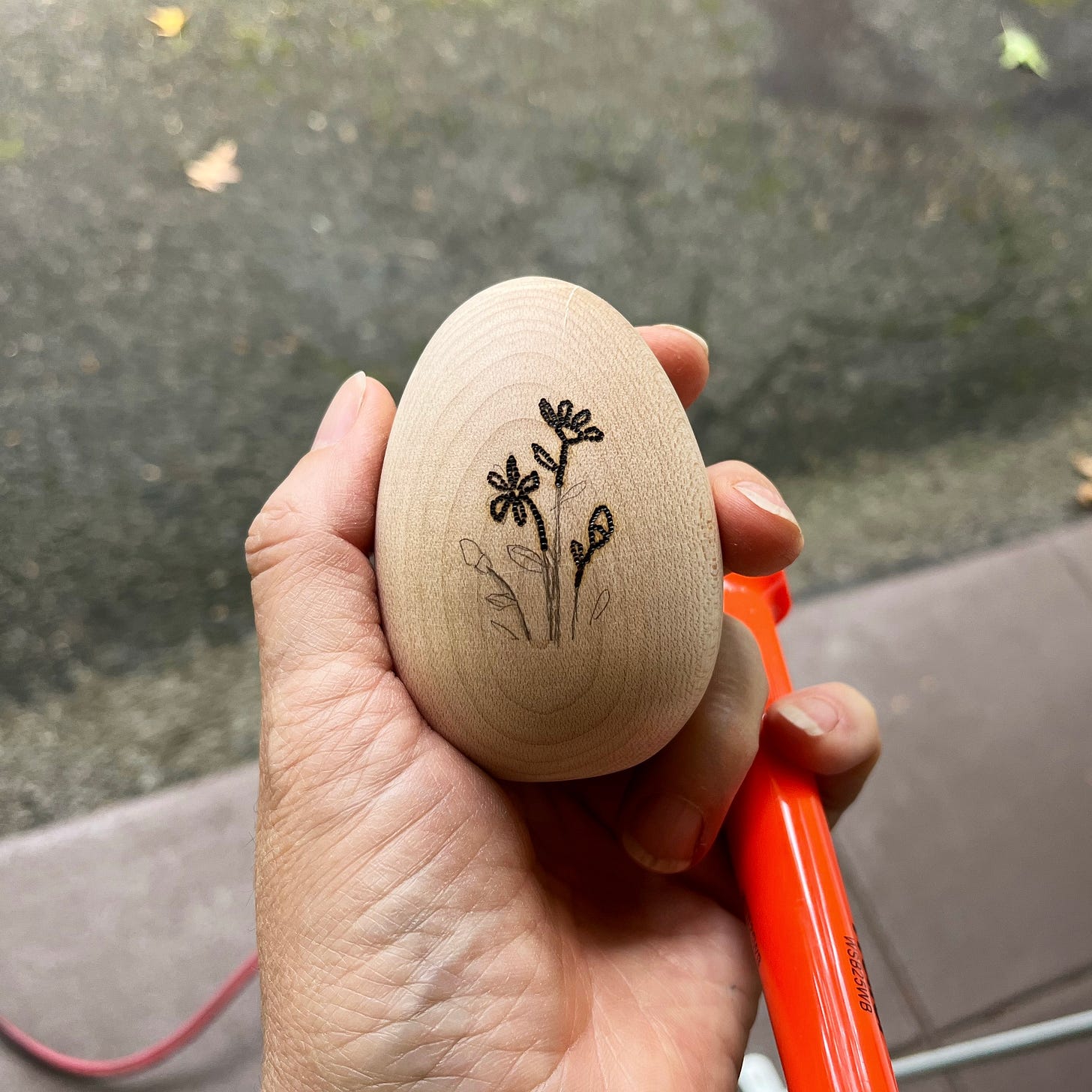 For the past couple years, I have been embellishing my work with a very basic wood-burning pen. It’s a very analog tool where I press each dot to form a line. The variability of the line quality that I get with this tool works for my aesthetic, whereas with the laser burner, it would look machine-made.