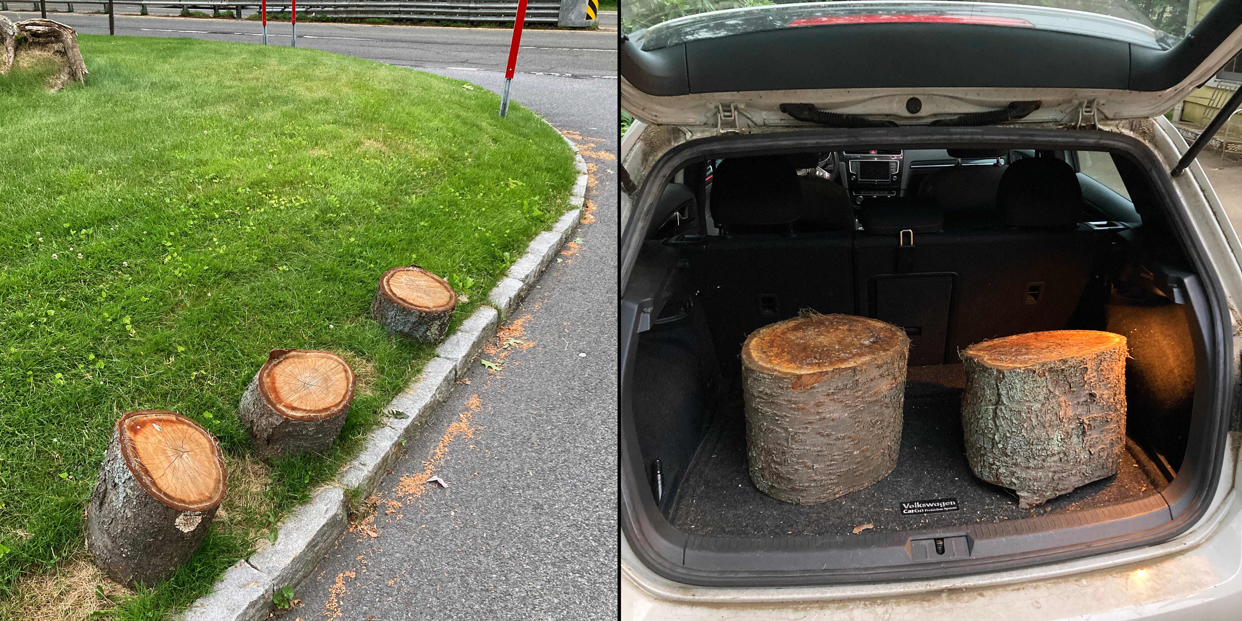I also find logs on the side of the road, such as the cherry logs below. I kept two for myself and brought the third one to share with my woodturning group. Some species are always worth stopping for, such as yew, cherry, or walnut. With the amount of logs that I have in my garage right now, I pass on oak and maple.
