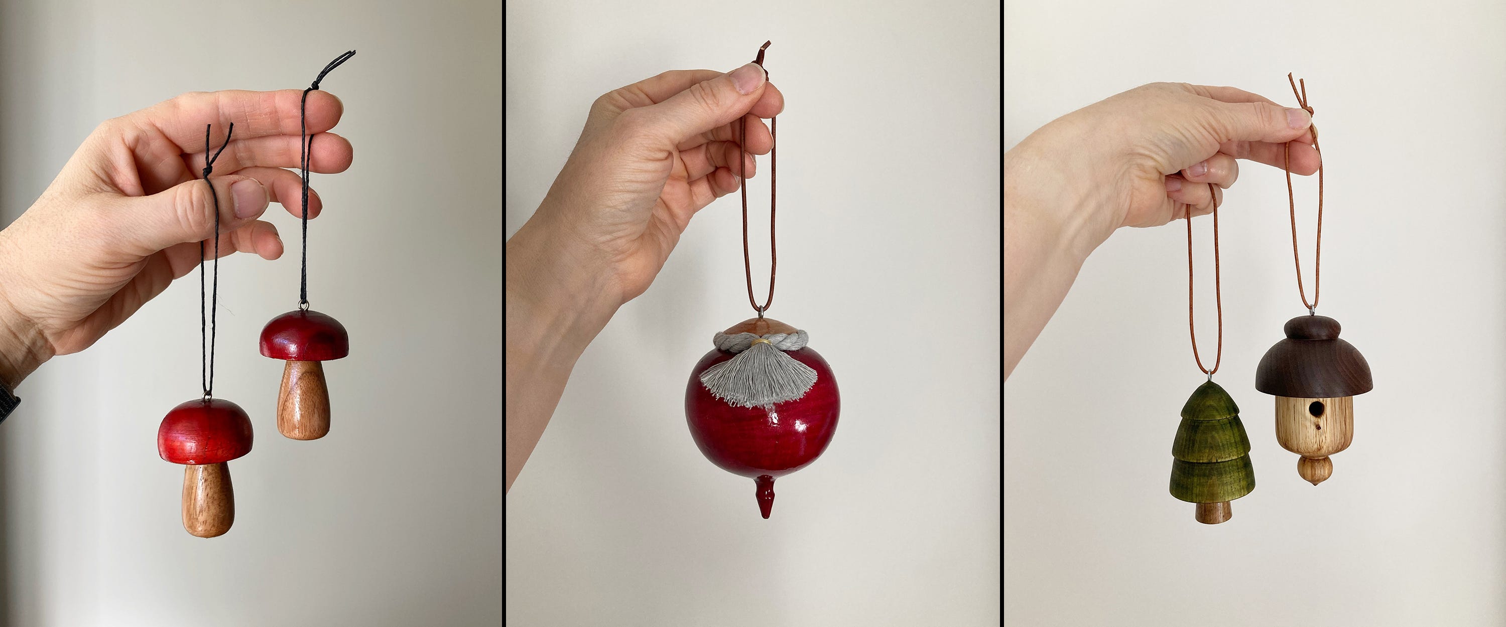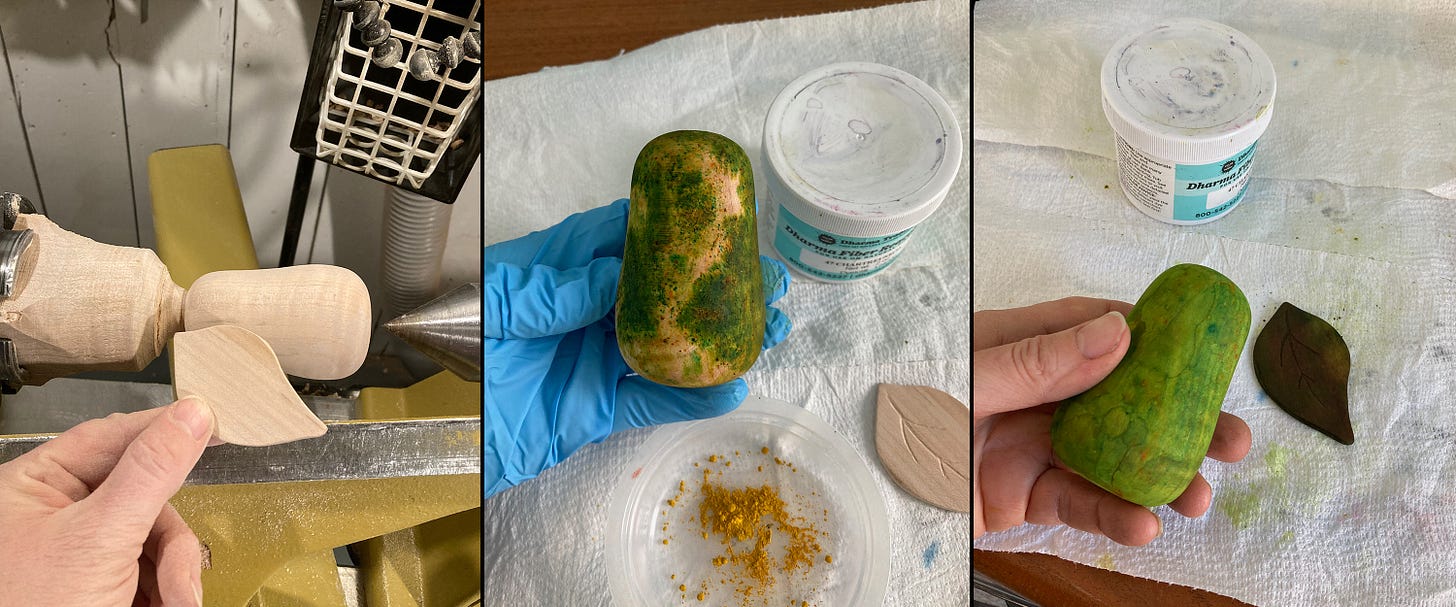 I use the powered dyes from Dharma Trading Company in the 2 oz size which I dissolved in water. Wearing gloves, I just dab it on to selected areas. This is how I made mushrooms and pine tree ornaments. The colors can be mixed to create new tints and shades. When applying the dry powder to damp wood, the component colors register a tie-dye effect for added variation.