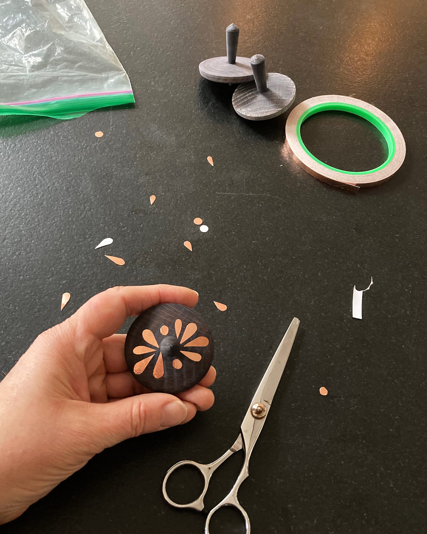 Very thin copper foil with an adhesive back is sold in rolls of varying widths for use in circuits, crafts, or as a slug repellant in the garden. When used on dark colored woods, it adds a bright contrasting element. On spinning tops, it will appear to flash as it spins. I cut out asymmetrical tear drops that I then arrange in larger designs. It’s very fiddly work and time consuming to get get them all placed right.