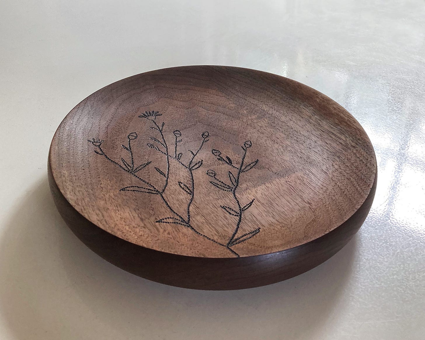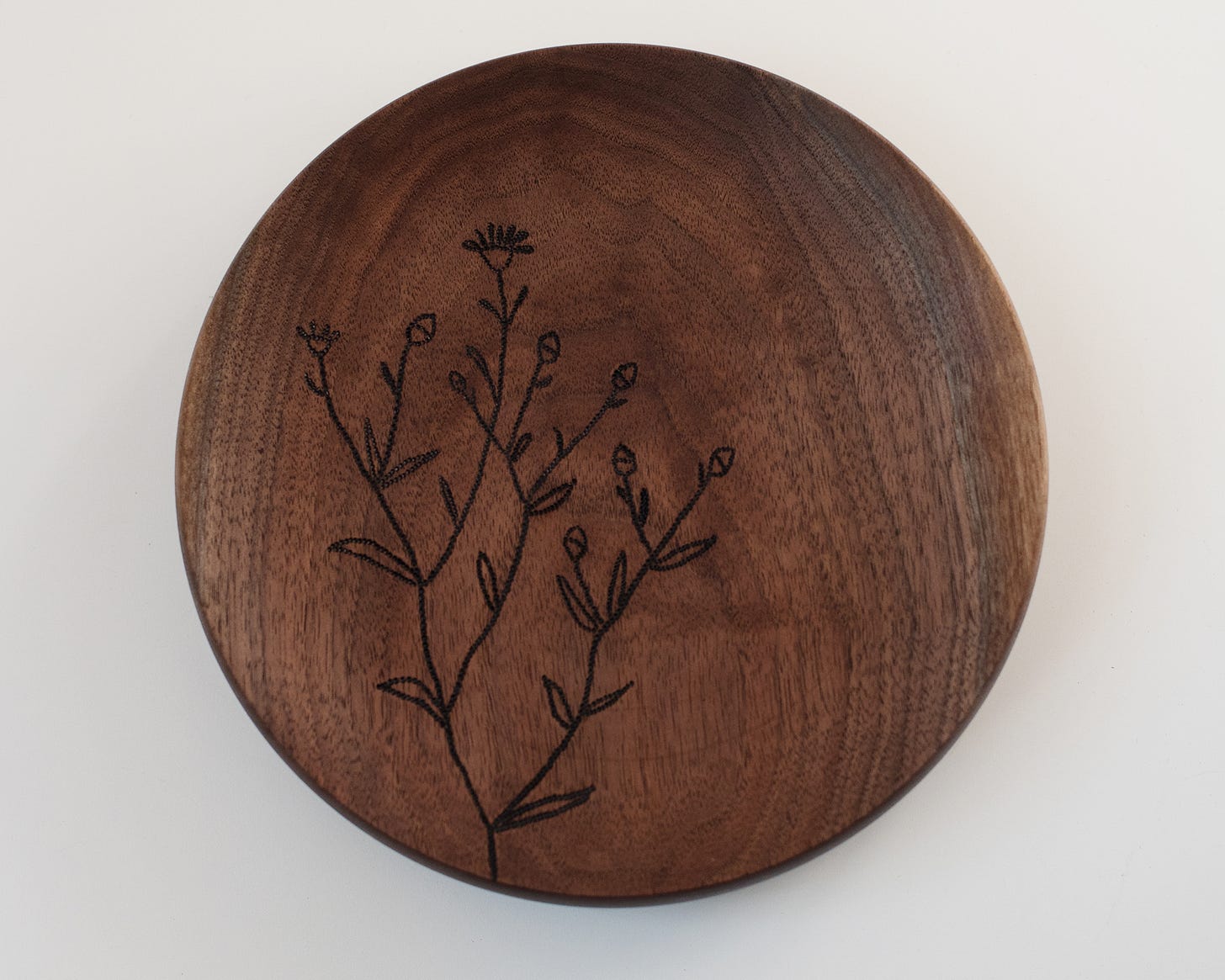 Continuing the theme of reworking a piece that I wrote about last month, I had an extra walnut pillow bowl from the set that I made for Chef Nicholas. When I originally made these, I made the bottoms with a recess that would make it easy to remount them should they ever need to be refinished. This particular bowl had some lighter colored sap wood on its rim that did not enhance its overall look, so I decided to cut it back and make a simple curved interior. Like the botanical design that I added to the salad bowl that I made last month, I used wood burning to add a drawing of an aster sprig.